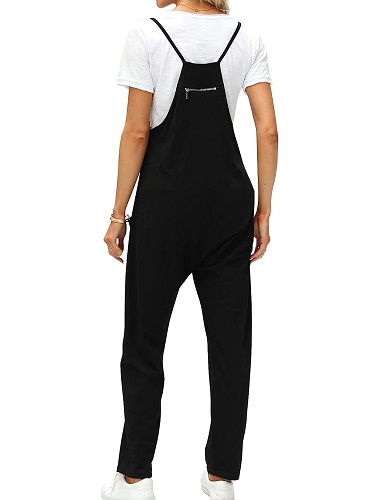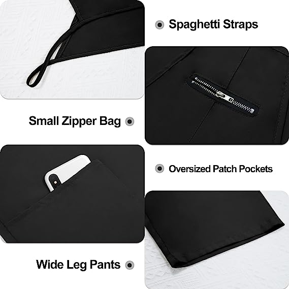 - Features: solid color classic V-neck overalls, women's sleeveless jumpsuit with thin shoulder straps, casual loose fit design, large patch pockets on both sides, convenient for carrying mobile phones, keys and other items. A small zip pocket on the back adds to the aesthetic. Suspender jumpsuit, black overalls, spaghetti strap jumpsuit, V-neck overalls, summer casual suspenders.